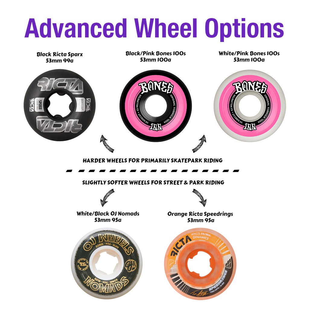 - Choose 99a or 100a wheels for dedicated Skatepark riding